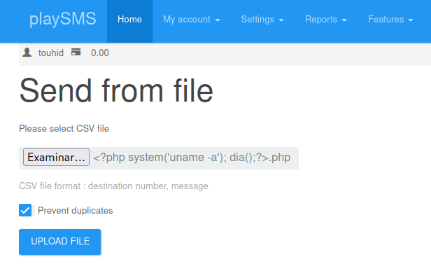 La contraseña era diana, dándonos acceso al panel del usuario touhid, una vez aquí podemos estudiar los diferentes vectores de ataque que tiene playSMS, toca googlear. Investigando sobre playSMS encontré diferentes vías de ataque que te daban acceso directo a la máquina con sus respectivos modulos en Metasploit, pero en mi opinión pierde un poco la gracia, por lo que seguí investigando hasta que di con este exploit: