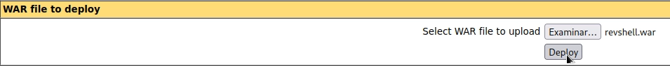 Parece que sí podemos subir un archivo .War permitiéndonos desplegar una aplicación maliciosa. Para ello podemos usar msfvenom, tenemos la cheatsheet del ataque mediante .War file en HackTrinks.