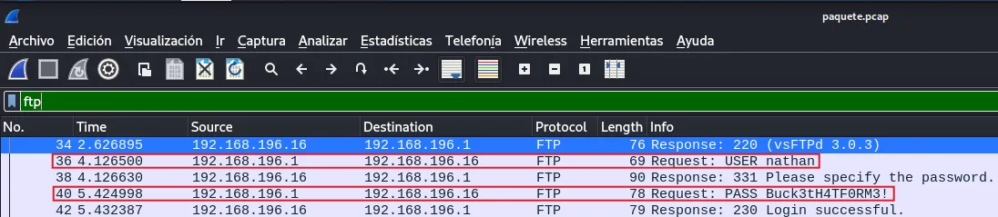 Como vemos en el archivo .pcap se han registrado las credenciales nathan:Buck3tH4TF0RM3! al loguearse por FTP, ya que este protocolo no posee cifrado de ningún tipo a diferencia de sFTP.